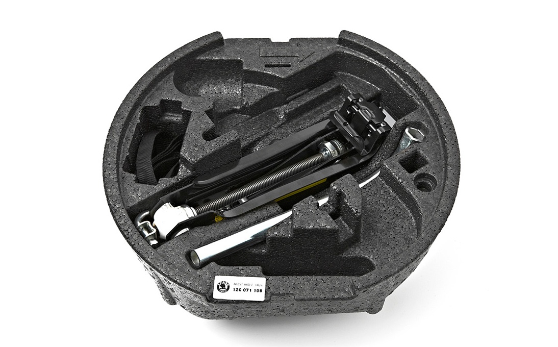 wheel instead of the puncture set in the event of a puncture. Set for spare wheel includes all the necessary tools for changing a defective wheel on the vehicle, the tools are stored neatly in a polystyrene box, the box is secured in the spare wheel recess by a woven strap with a clasp, the spare wheel itself is not included with this set. Please refer to the Owner‘s Car Manual for detailed instructions on how to use the spare wheel.