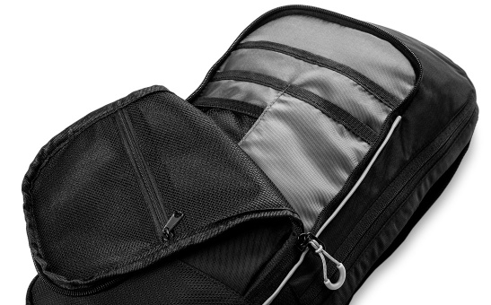 Predné menšie vrecko na zips ponúka niekoľko praktických priehradok na drobnosti. Priestranné zadné vrecko je prispôsobené na vloženie hydrovaku – hadičku s náustkom možno jednoducho pretiahnuť špeciálnym otvorom a popruhom.