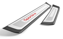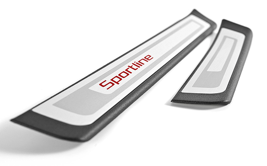 Ako ochrániť karosériu prahov dverí pred nečistotami a zároveň zvýšiť atraktivitu vozidla? Riešením sú plastové kryty prahov s vložkou z nehrdzavejúcej ušľachtilej ocele. Zatiaľ čo spodný plastový kryt z odolného materiálu TPU / ABS dokonale doľahne na karosériu a ochráni ju pred škrabancami, vrchná vložka striebornej farby dodá interiéru vozidla lesk zakaždým, keď otvoríte dvere. Vložky pri predných dverách navyše zdobí červený nápis Sportline, ktorý skvele doplní športovo zariadený interiér.