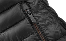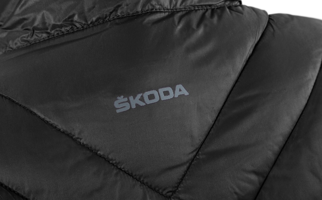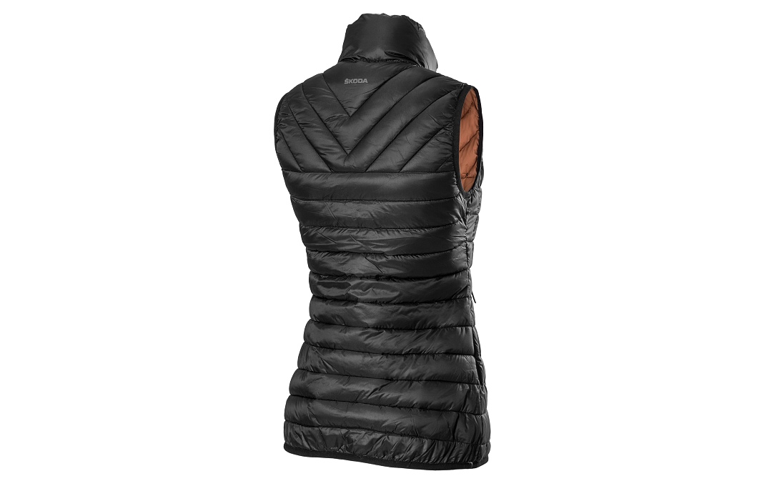 Ultraľahká dámska zimná vesta v športovom dizajne, ktorú je možné zbaliť do príručného vaku. Čierna vesta má kontrastne prešité zipsy, vyšší golier s prekrytím zipsu pri brade, prieramky zakončené gumou a náprsné vrecko s vývodom pre slúchadlá. Decentné logo ŠKODA na zadnom diele.