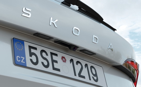 Zadná parkovacia kamera zo sortimentu Škoda Originálne príslušenstvo sa automaticky aktivuje zaradením spätného rýchlostného stupňa, zobrazuje priestor za vozidlom a zároveň vyznačuje jazdné línie v šírke vozidla.