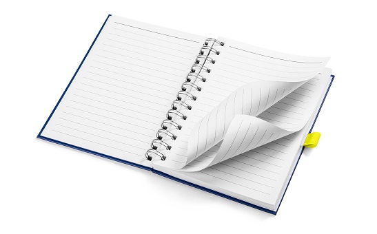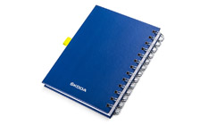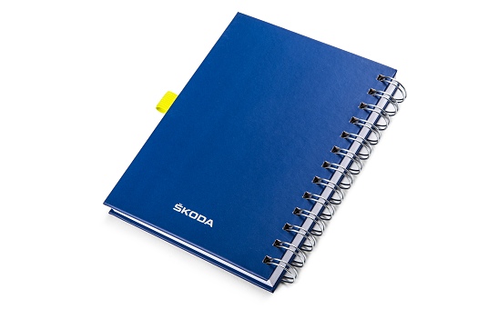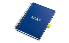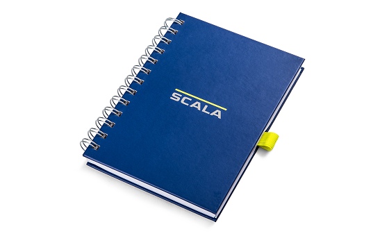 Zápisník s brandingom SCALA. Na boku sa nachádza žlté pútko na pero.